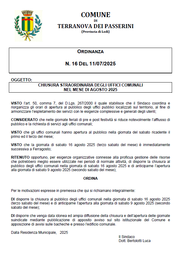 Chiusura straordinaria degli uffici comunali nel mese di agosto 2025